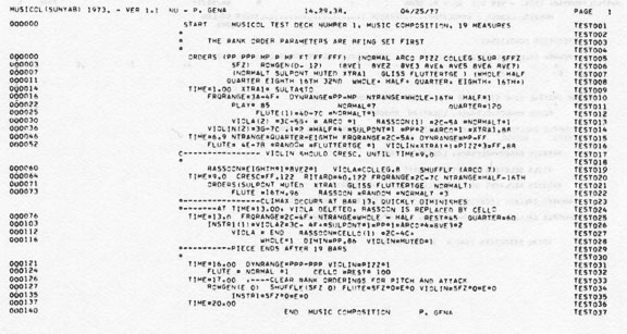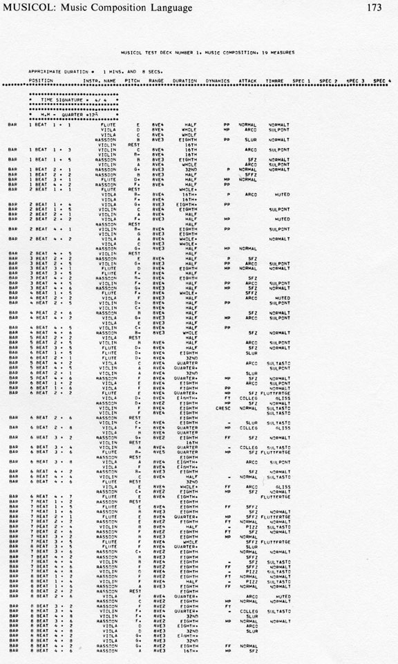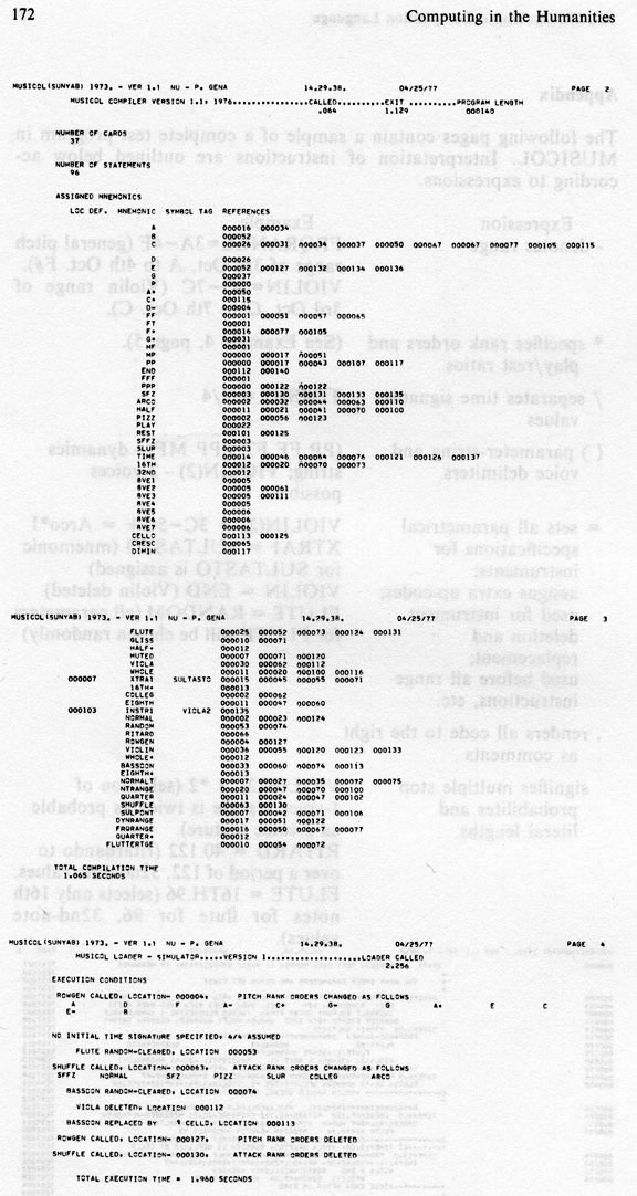 | 165 MUSICOL: Musical Instruction Composition Oriented Language P. Gena MUSICOL, a computer language for composing music, was originally developed for composers with no previous knowledge of computer programming. A thorough description of the language and its use is found in MUSICOL Manual, Version 1. To facilitate the reader's understanding of the body of this paper, a sample MUSICOL program has been included in the appendix. The mnemonics table consists of conventional musical terms of up to ten characters (for example, VIOLA, FLUTE, D, G, PIZZ, MF, QUARTER, SULPONT, REST, 8VE4), and common punctuation marks that serve as non-arithmetic expressions (for example, / ( ) * - . +). Only zero and positive integer constants are used as operands after expressions. MUSICOL statements (instructions) have a free format, and columns 2 to 72 of each card may contain as many of them as desired by the programmer. An incomplete statement continues on the next card providing no operation code is split. Expressions and blanks are recognized as delimiters. Any character in the first column of a card will allow fields 1 to 72 to be treated as comments. Similarly, the use of a comma in any column will render the remainder of the card free from compilation. Columns 73 to 80, which are ignored by the compiler, serve as the identification field. The MUSICOL user has the flexibility to determine the process for choosing among strings of musical parameters (pitch, duration, range, attack, timbre, dynamics, and texture) in successive blocks of time, the lengths of which are variable. A total of sixteen different instruments can be used simultaneously. These are chosen from a list of common instruments stored in the mnemonics table (such as VIOLIN, FLUTE, PIANO, VIBRAPHONE), including non-pitched percussion. In addition, there are extra codes (INSTRI, INSTR2, etc.) available for assigning instruments not included in the table, or others (XTRAI, XTRA2, etc.) for timbres and attacks not contained. The contents for the strings of the individual parametric elements to be used in the compositional process can be declared by the composer, or generated by special routines. If no parameter string is indicated by the user, elements are randomly chosen from the appropriate collection in the mnemonics table. All of these features can be selected, changed, respecified, or eliminated at any point in the user's MUSICOL program. 166 Computing in the Humanities Selection of Musical Parameters Total randomness, stochastic processes, and literal selection are the three general methods presently available to generate parametric content. Various aspects of these techniques can be used alone or simultaneously within a time-block to achieve desired parametric configuration. A random generator is used to some extent in all decisions, with the exception of the literals declarations. Total randomness (zeroth-order) is assumed when no specific instructions are given as to how a choice, for an instrument or group of instruments, is made from the elements belonging to a musical parameter. Hence, the parameters affected are selected randomly from the pertinent list in the stored table. If a partial list of members in the table is desired for selection at equal probability, the mnemonics may be listed in a string within the time-block. During the compositional process, only those in the declared list will be eligible for inclusion. In addition, such a list of elements can be randomly generated, and the specific choice would, in turn, be impartially made. Furthermore, a parametric string, whether determined by the composer or generated, can be shifted about. This shuffling procedure can be called at any time, repeatedly, at the discretion of the composer. A more interesting aspect of computer-aided composition constitutes the application of stochastic methods for parametric selection. Each element belonging to a parameter-class is assigned a rank order, that is, a hierarchy is established according to the percentage representing the probability of its occurrence. The most basic stochastic process in MUSICOL determines the texture of the composition by means of a play/rest ratio. Percentages of play/rest, derived from weighted probabilities, can be set inclusively for all instruments or for each individually. If a play probability of seventy-five percent is assigned, a twenty-five percent chance of rest is automatic. The elements of a declared parametric string can be subjected to stochastic selection by the use of rank ordering. These proportional percentages are chosen according to distributions as outlined in the following paragraphs. To generate probabilities for parametric elements in a string, the basic random procedure can be weighted by merely repeating elements in accordance with their projected ranking. Since each element in a string receives equal distribution, repetition will increase its probability. In the following list: (B A B-flat B C D-flat F B C B A C) the pitch B (four occurrences) will have the greatest probability, that of 4/12 or 1/3, followed by C at 1/4, then A at 1/6. B-flat, D-flat and F will each have the same assignment, 1/12. This simple operation, of course, can be implemented successfully for all parameter strings. The maximum list size of twenty-four elements allows a wide range of probability manipulations. The third type of stochastic technique used for parametric selection is a simulation of an experimental result originally pointed out by George Kingsley Zipf. Zipf performed statistical studies on the English language where words from substantial texts were listed in order of frequency of occurrence, or rank-ordered. The results of these rank orders, plotted against the frequency, show relatively linear graphs. Therefore, each rank order has a probability approximately equal to the reciprocal MUSICOL: Music Composition Language 167 of its number. Example 1 ---- Rank order: 1, 2, 3, 4, - Probability (P): 1/