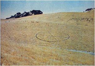 The agrarian reference of Grind, might recollect the work of the late American artist Dennis Oppenheim, whose work often used a canvas of wheat or grass fields, giving a more immediate though finite, time-sensitive existence. Though on a much smaller scale, the 1969 earthwork installation, Branded Mountain, also a wheel thirty-five feet in diameter, is a supersized pattern of a branding iron etched in burned grass on a pasture (Fig. 7). The brand is that of the actual cows that grazed on the land and gradually eradicated the piece. Like Grind, it is placed on a slight incline.