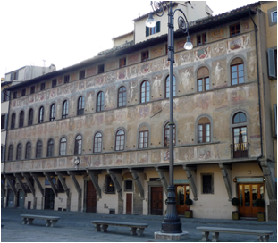 Because his figurative geoglyphs are constructed for aerial viewing, where distance homogenizes the individual rocks and flattens the image, Rogers had to confront the crucial elements of placement, range, size and perspective. In Renaissance architectural space, a curious application of Brunelleschis experiment with linear perspective can be seen in the construction of the Palazzo dell'Antella (second half of the 16thc.) in the Piazza Santa Croce (Florence, Fig. 8). Viewed from a distance, the windows are gradually set closer together in the direction of the faade of Santa Croce, allowing a concentrated sense of the foreshortening—the flattening of depth—when viewed from the west, pointing toward the church—a temporal drive to the cadence, as in Renaissance music, or a leveling of it as one looks out from the church.