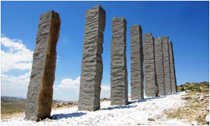 The geoglyphs in Cappadocia (Fig. 1) from Time and Space by Andrew Rogers, as they sit motionless, are predestined to beg the question of time in the grandest sense. The rough and often jagged textures of the basalt monoliths suggest Neolithic observational and ceremonial sites, taking on an essence that is at once spiritual and pagan. Other groupings appear as civic ruins. They witnessed the convivial atmosphere of hundreds and hundreds of hired local workers who, in a makeshift cooperative, placed each of the thousands of stones to form the figurative works. These monoliths exude the wisdom of the past as well as confidence in the future. They are fraught with memory and clairvoyance. As an initiate walks through the park the already ambiguous species present is stretched beyond ordinary experience, save for the immediacy of legible text etched on a number of columns.